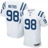 Be ready to get into this game season with this Indianapolis Robert Mathis elite jersey! It features your favorite player's number #98 in tackle twill fabric stitched on the front, back&shoulders and the player's name MATHIS are sewn on the upper portion of the back. For the purpose of long-lasting durability and easy movements, this White Mathis Indianapolis elite jersey is made of heavier-weight materials and has an athletic cut. That does not feel like a T-shirt but will fits snug in the chest and shoulders. Besides, the two mesh side panels will provide additional breathability for the Robert Mathis fans. Having all details as the gear your hero wears on the field, this Indianapolis Robert Mathis elite jersey will offer you a truly authentic experience!
