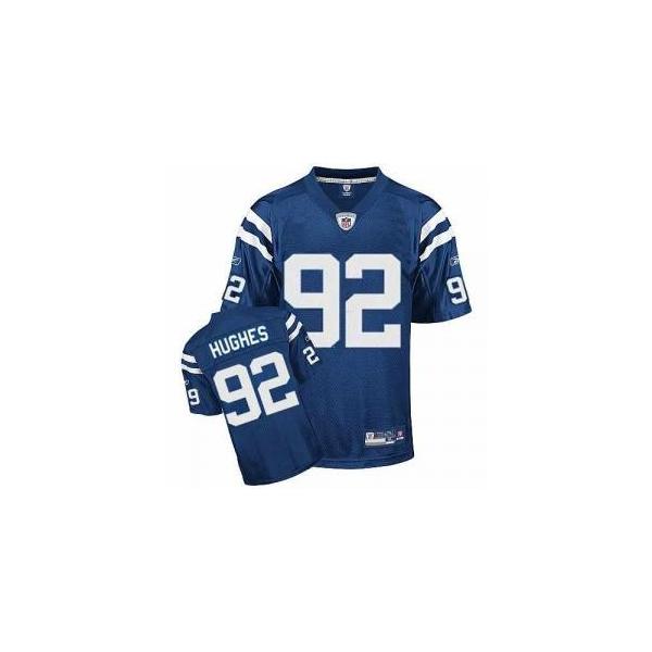 This Jerry Hughes Football Jersey is made of 100% polyester(diamond back mesh, durable and fast drying)Letters(HUGHES) and numbers(92) are sewn on.Indianapolis team logos and wordmarks are stitched, when applicable. Free shipping and 45days returnable.