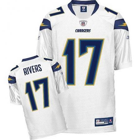 Letters(RIVERS) and numbers(17) are sewn on. San Diego football team logos and wordmarks are stitched, when applicable.