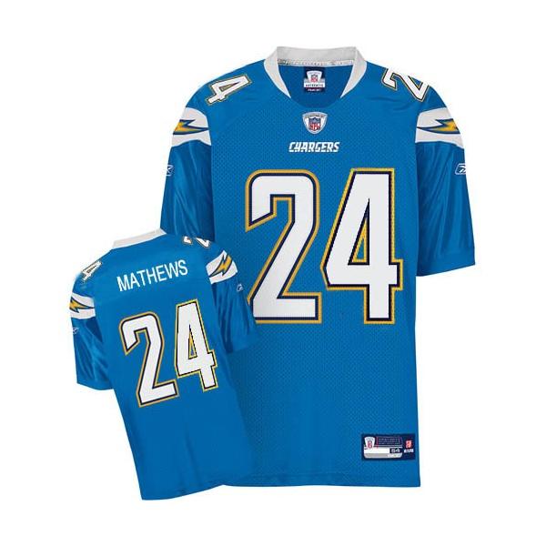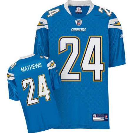 Letters(MATHEWS) and numbers(24) are sewn on. San Diego football team logos and wordmarks are stitched, when applicable.