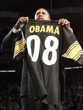 US Democratic presidential nominee Barack Obama holds up a Pittsburgh Steelers football jersey given to him by Dan Rooney, chairman of the Pittsburgh Steelers football team, during a campaign rally in Pittsburgh, Pennsylvania, October 27, 2008.
